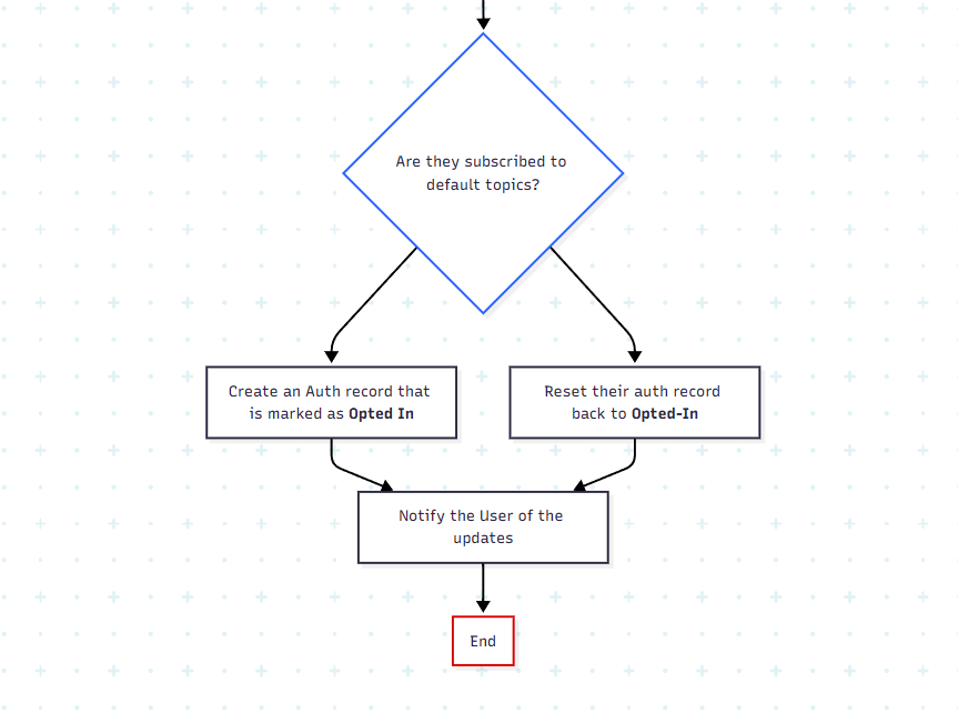 G{"Are they subscribed to default topics?"} --> H["Reset their auth record back to <b>Opted-In</b>"] & I["Create an Auth record that is marked as <b>Opted In</b>"]