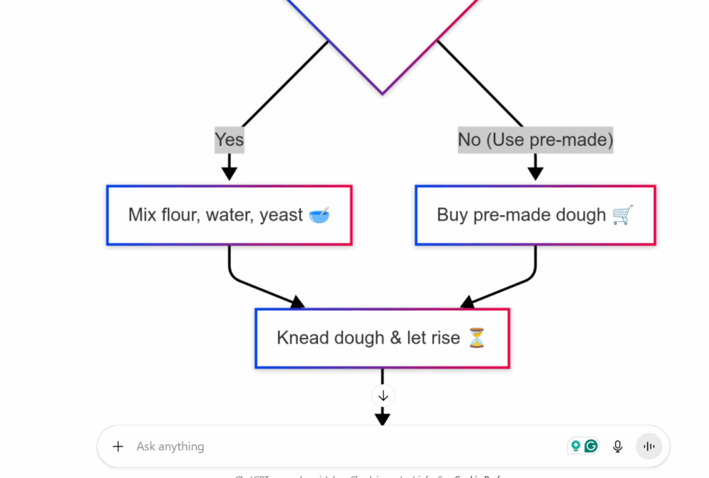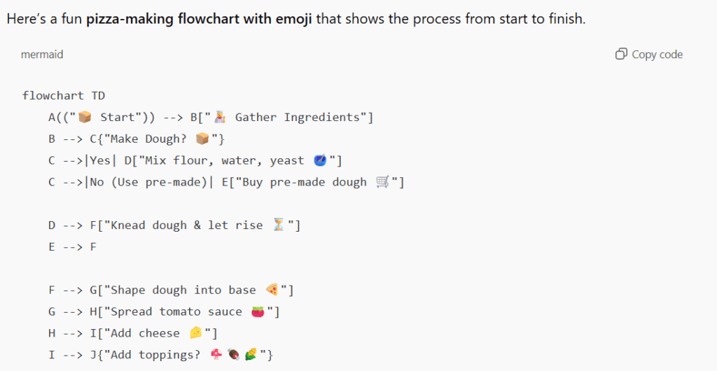 When done through ChatGPT, you’ll get all the code generated, all from a prompt – “Create a flowchart for making pizza. Add emoji.”