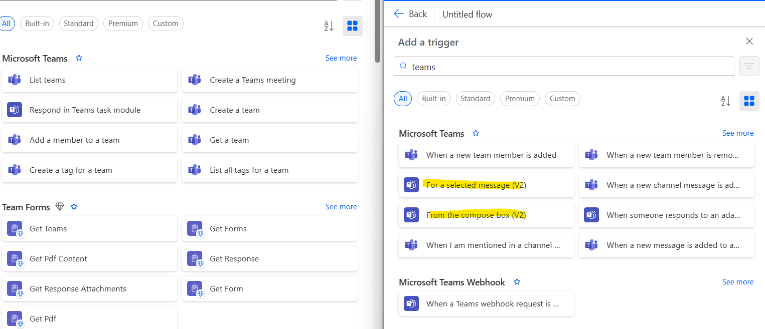 In this dataverse (plain environment), I was surprised to find that some of the Power Automate connectors were not all there, and/or I was going to be working with legacy versions of these connectors. The screenshot below illustrates the differences in the Teams Connector – on the left, we have the plain, vanilla Dataverse, and on the right is a Dataverse that has Dynamics 365 installed in it