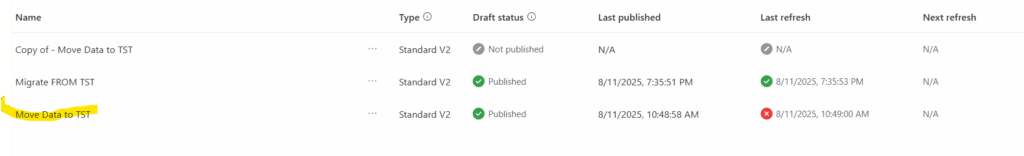 I’m not sure if this saves a step in configuration, but it’s worth noting, the Dataflow you create executes to the target that you are importing data into. So in the below example, the “Migrate FROM TST” flow pulls data from TST into DEV, but the “Move Data to TST” will fail.