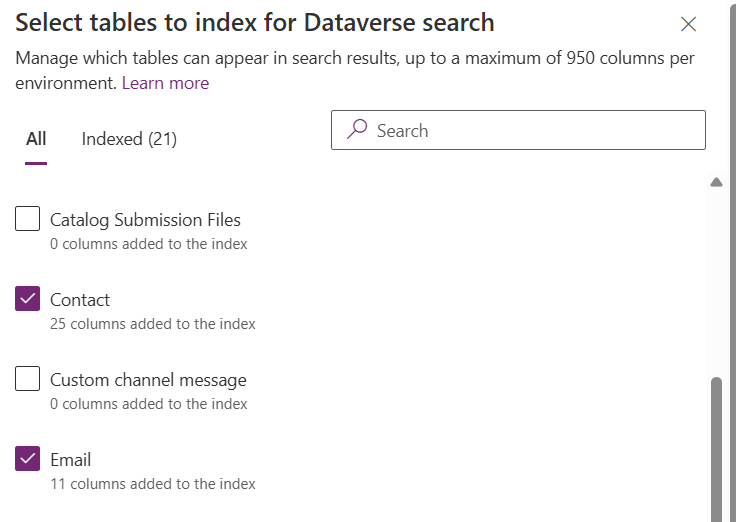 When you click “Manage Search Index”, you get a more detailed view of what is happening in each entity and particularly how many columns are used in the index.